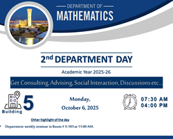 The Department of Mathematics offers undergraduate students Bachelor of Science programs in Mathematics, Actuarial Science and Financial Mathematics. Graduate level programs lead to Master and Doctorate Degrees in Mathematics. Some new concentrations have been developed and introduced for undergraduate programs. Many Professional Master Programs have also been developed and introduced. Students planning undergraduate and graduate studies at KFUPM will find a congenial department and faculty of international stature.
