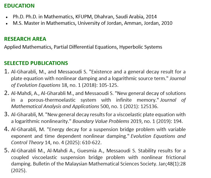 Algharabli, Mohammad. Associate Professor Building 5 Room 324 +966 13 860 2466 mahfouz@kfupm.edu.sa