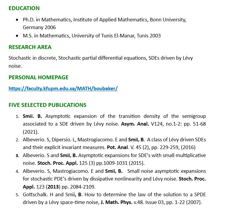 Boubaker, Smii. Associate Professor Building 5 Room 203/3 +966 13 860 7763 boubaker@kfupm.edu.sa