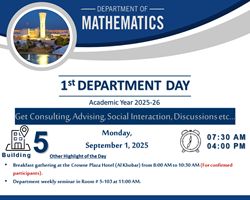 The Department of Mathematics offers undergraduate students Bachelor of Science programs in Mathematics, Actuarial Science and Financial Mathematics. Graduate level programs lead to Master and Doctorate Degrees in Mathematics. Some new concentrations have been developed and introduced for undergraduate programs. Many Professional Master Programs have also been developed and introduced. Students planning undergraduate and graduate studies at KFUPM will find a congenial department and faculty of international stature.